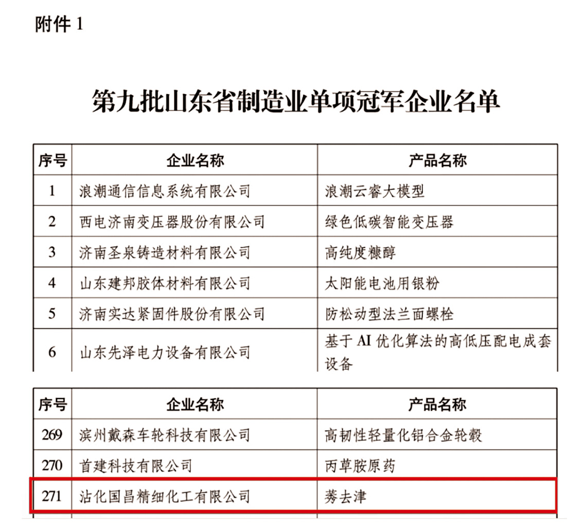 12月10日,山東省工業(yè)和信息化廳正式公布了第九批制造業(yè)單項(xiàng)冠軍企業(yè)名單,沾化國(guó)昌精細(xì)化工有限公司憑借核心產(chǎn)品 “莠去津”的突出表現(xiàn)成功入選。此次獲評(píng)標(biāo)志著企業(yè)在 “莠去津”這一細(xì)分領(lǐng)域已達(dá)到全省領(lǐng)先水平,在技術(shù)水平、市場(chǎng)占有率及品牌影響力方面獲得權(quán)威認(rèn)可。