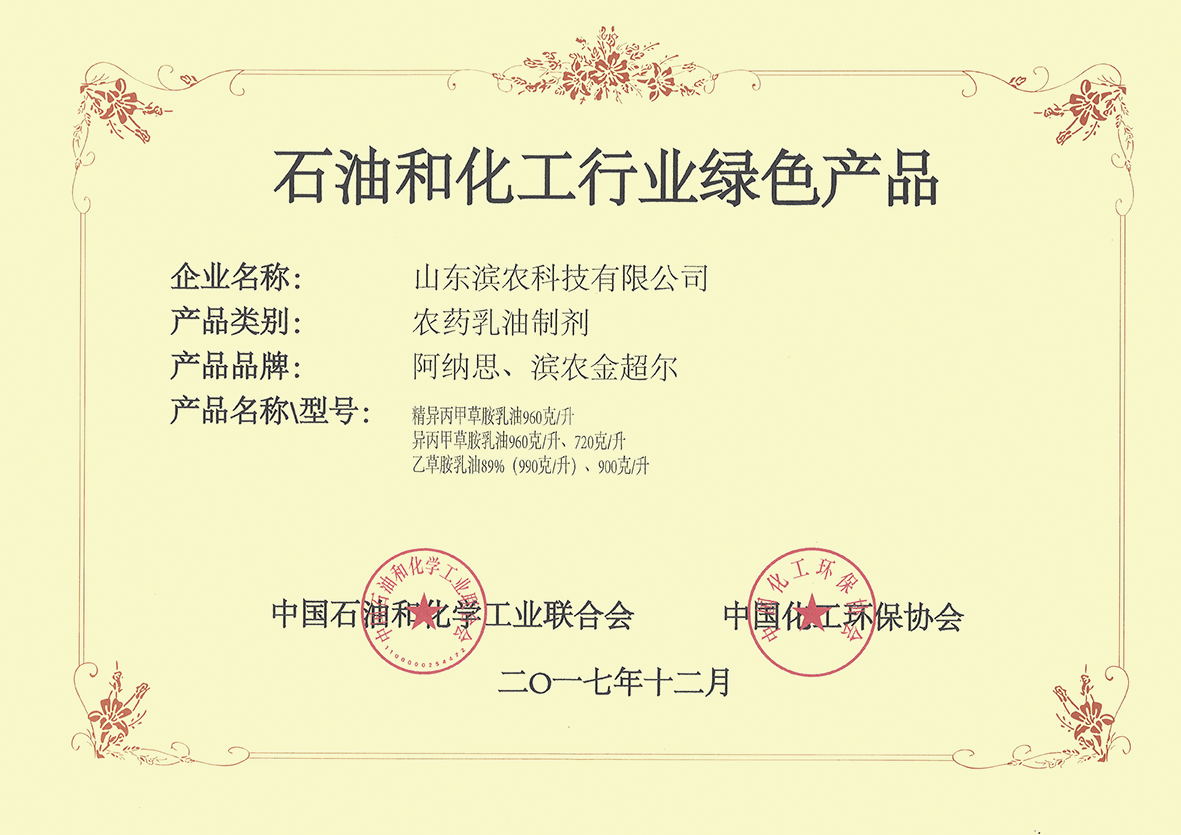12月14日,由中國石油和化學工業(yè)聯(lián)合會和中國化工環(huán)保協(xié)會主辦的“2017年石油和化工行業(yè)綠色發(fā)展大會”在北京隆重召開,山東濱農(nóng)科技有限公司農(nóng)藥乳油制劑 “960 克/升精異丙甲草胺乳油”“960 克/升、720 克/升異丙甲草胺乳油”“89%(990 克/升)、900 克/升乙草胺乳油”等產(chǎn)品被認定為“石油和化工行業(yè)綠色產(chǎn)品”并獲頒證書。