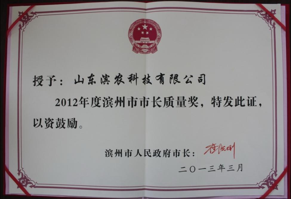 我公司榮獲2012年度濱州市市長質(zhì)量獎發(fā)布時間:2014-06-16 10:262013年3月13日,濱州市人民政府濱政字【2013】37號文件《關(guān)于表彰2012年度濱州市市長質(zhì)量獎獲獎單位和個人的通報(bào)》,公布了2012年度市長質(zhì)量獎的獲獎企業(yè)和個人名單。 我公司喜獲2012年度濱州市市長質(zhì)量獎。 5月9日下午,第三屆濱州市市長質(zhì)量獎頒獎大會在市政大樓隆重召開,會上,濱州市委副書記、市長崔洪剛出席會議并為獲獎的4家企業(yè)和1位個人頒獎。我公司副總經(jīng)理李華參加會議并接受頒獎。 ![]() |