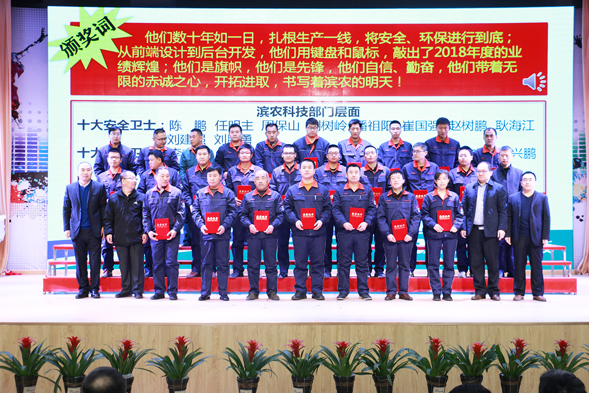 濱農科技·國昌集團2018-2019總結表彰暨動員部署大會隆重召開發布時間:2019-03-06 15:36本報訊 2月1日,濱農科技·國昌集團2018-2019總結表彰暨動員部署大會在國昌實驗學校二樓報告廳隆重舉行。國昌集團、濱農科技全體高中層管理人員及部分優秀員工代表、先進個人共400余人參加了本次大會。 大會分為四項議程,首先由濱農科技總經理張茂貴、國昌集團總經理夏毅飛分別宣讀了國昌集團、濱農科技2018年度突出貢獻獎、優秀管理者、銷售冠軍、銷售標兵的表彰決定;接著,集團公司全體高層為在2018年度做出突出貢獻的先進個人及團隊分別頒發了榮譽證書并合影留念,大會通過宣讀頒獎詞的方式,傳達了對先進工作者的肯定,也鼓舞了大家2019再創佳績的信心;隨后,國昌集團、濱農科技優秀管理者代表甕丙峰、李東,銷售明星代表于瑩、陳學付,優秀員工代表呂國強、馬曉亮先后作了典型發言。 黃總對獲獎者表示祝賀并做了動員部署重要講話。2018年兩板塊的經營業績和存在的生產經營問題做了全面總結,并分析了兩板塊2019年度的行業格局和市場環境,對2019年度兩板塊的經營目標和工作重點做了重要部署。 最后,黃總勉勵大家:時間新故相推,一往無前,奮斗接續發力,永不止步。工作既是責任,責任就是擔當。幸福是奮斗出來的,奮斗本身就是幸福,讓我們以奔跑者的姿態,奮進的腳步,實干的作風,共同書寫并綻放2019年的華彩!