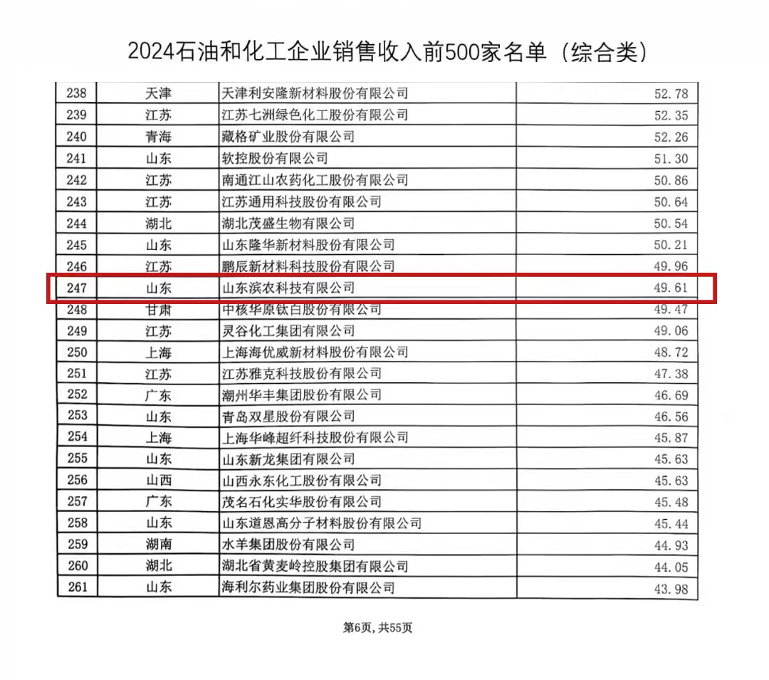 濱農(nóng)科技榮登2024中國石油和化工企業(yè)500強(qiáng)榜單發(fā)布時(shí)間:2024-10-10 10:139月12日,2024石油和化工企業(yè)銷售收入500強(qiáng)(前500家)發(fā)布會(huì)在山東東營舉行。發(fā)布會(huì)以“實(shí)現(xiàn)由大到強(qiáng)的跨越”為主題,揭曉了2024中國石油和化工企業(yè)500強(qiáng)榜單,濱農(nóng)科技以49.61億收入位列石油和化工企業(yè)500強(qiáng)綜合類企業(yè)第247位。未來,濱農(nóng)科技將繼續(xù)秉承初心,砥礪前行,不斷提升企業(yè)的綜合實(shí)力和市場(chǎng)競(jìng)爭(zhēng)力,為石油和化工行業(yè)的發(fā)展做出更大的貢獻(xiàn)。 ![]() |