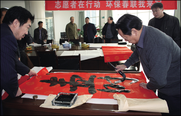 1月29日上午,由濱州市環(huán)保局、環(huán)保協(xié)會聯(lián)合舉辦,我公司冠名贊助的環(huán)保春聯(lián)有獎征集暨現(xiàn)場書寫在我銷售公司三樓會議室隆重開展。濱州市環(huán)保協(xié)會邀請我市書法協(xié)會主席孫樹勛先生等八位書法家,義務參加“志愿者在行動,環(huán)保春聯(lián)我來寫”活動,現(xiàn)場潑墨揮毫,書寫環(huán)保春聯(lián)一百多幅,墨香氤氳的和諧場面,暗合了“青山環(huán)北郭,綠水繞東城”的美好和諧意境。