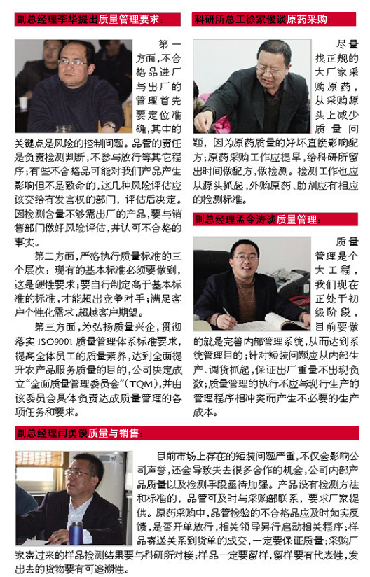 在本月質量管理月度例會上,公司部分高層管理者針對自己負責板塊存在的質量隱患和改進措施提出意見和建議: