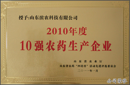 2011年1月21日,山東省農藥檢定所召開了2011年山東省農藥管理工作會議,會上山東濱農科技有限公司被評為2010年山東省農藥“四培育”活動10強農藥生產企業第一名。會議由省藥檢所所長楊理健主持,部所和省農業廳領導就農藥管理工作分別講話,并為獲獎單位頒發獎牌。山東濱農科技有限公司市場總監楊希坤代表獲得10強生產企業作了典型發言。